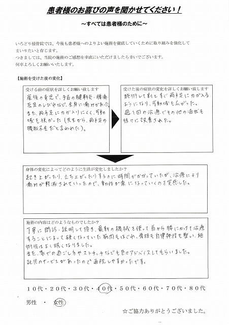 最初の1回目の施術の時点で体の軽さが全く違いました。重しを取り除いたようでとても感動し、頑張って続けようと思いました。