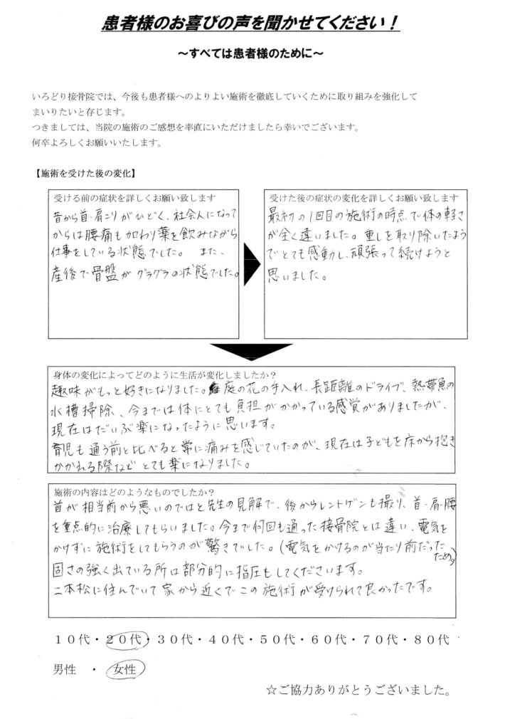 W.Y様 20代 ①肩こり ②腰痛 ③産後骨盤矯正