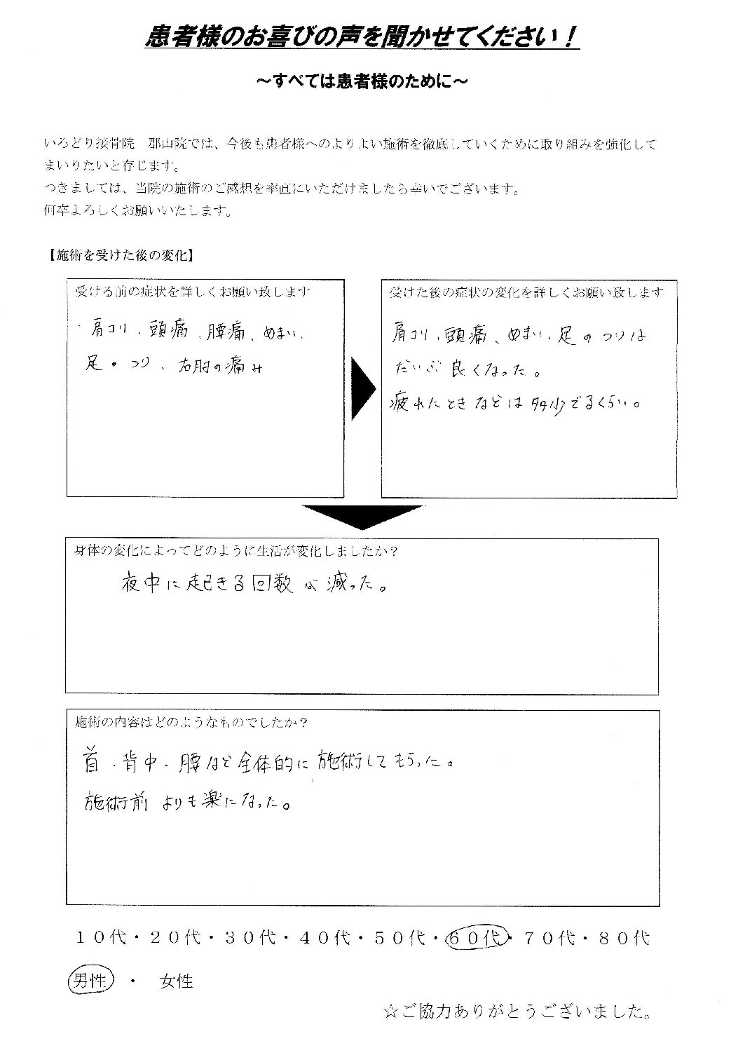 肩こりからの頭痛も治療を受けてからはほとんど起こらなくなり、身体も楽になっております。