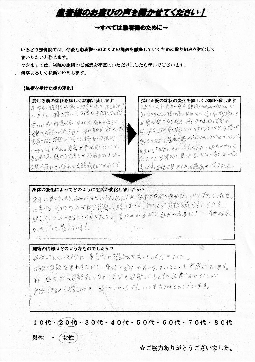 施術前よりも自分の身体を大切にする意識が強まったと思います。